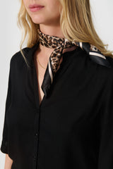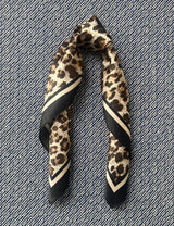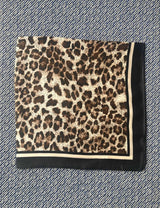 Dette silketørklæde er med beige baggrund med sort leopard mønster med en creme og sort bord. De små silketørklæder er bandana størrelse, og lavet til at kunne binde i en enkelt knude om halsen.