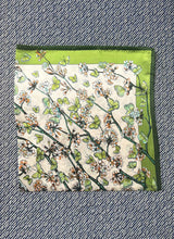 Dette silketørklæde har en lys hudfarvet baggrund med sommerfugle i limegrøn og blomster grene i grønne, hvide og turkise nuancer med en bred limegrøn bord og lidt mørkere grøn kant yderst.