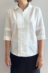 Vores nye Stine skjorte er en feminin skjorte med korte ærmer med plisseringer, almindelig pasform, rund krave og plisseringer langs knaplukningen. Skjorten er produceret i en lækker deadstock bomuld med små cirkler i stoffet, og er kun lavet i et begrænset antal på 20 stk. Modellen er normal i størrelsen.