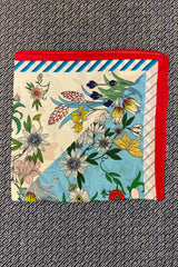 Dette silketørklæde er opdelt i to baggrundsfarver; lyseblå og råhvid, det har et stort farverigt blomster og sommerfugle print i klar gul, orange, limegrøn, lilla, rosa, valmue rød og blå farver. Tørklædet afsluttes med en råhvid/ tyrkis blå stribet bord med en klar rød kant yderst.