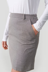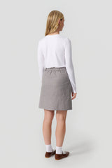 Annika nederdelen er en klassisk nederdel i en kortere version, som slutter omkring midt på låret. Nederdelen har normal talje, let a-form snit og lommer i siden. Der er elastik bagpå i talje og en skjult lynlås i siden.
