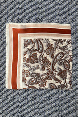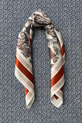 Dette silketørklæde er med lys creme baggrund med sjalsmønster i rust brune farver med to rosa/nude nistrede og en klar rust orange bred stribe som bord.