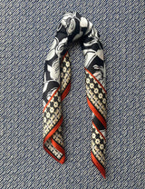 Dette silketørklæde har sort baggrund med et hvidt storblomstret print med en grafisk mønstret kant i grå, sort og gul beige farver samt 2 rust orange striber.
