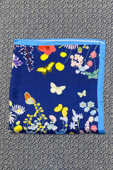 Dette silketørklæde er med mørk blå baggrund, blomster og sommerfugle print i klar gul, orange, lys limegrøn, creme, lilla, rosa, valmue rød og blå farver. Tørklædet afsluttes med en dueblå bord.