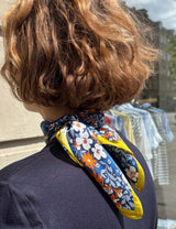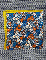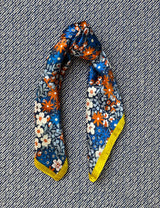 Dette silketørklæde er med dyb blå baggrund, blomster print i hvid, orangerust, lyseblå og klar blå farver med en lime gul kant.