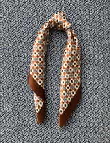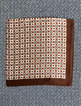 Dette silketørklæde er med grafisk mønster i brun, hvid, nude, rust og sølvgrå med en bred brun bord.
