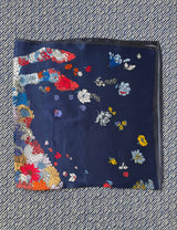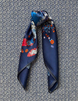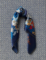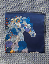 Dette silketørklæde er med dyb blå baggrund, blomster print i hvid og mange stærke blå, røde, gule og lilla farver med en mørk navy tynd kant. Tilsammen danner blomsterne en hest, det ses kun når tørklædet er foldet helt ud.