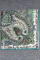 Dette silketørklæde er med en vanilje baggrund med sjalsmønster i grøn, bordeaux, blå og turkise vandfarver, rosa bord med forskellige dyr og turkisblå kant.