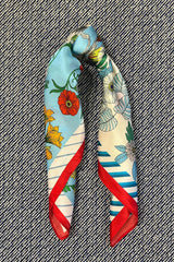Dette silketørklæde er opdelt i to baggrundsfarver; lyseblå og råhvid, det har et stort farverigt blomster og sommerfugle print i klar gul, orange, limegrøn, lilla, rosa, valmue rød og blå farver. Tørklædet afsluttes med en råhvid/ tyrkis blå stribet bord med en klar rød kant yderst.