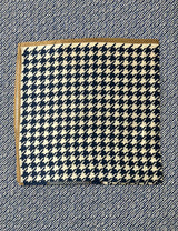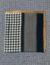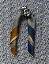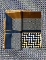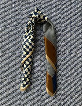 Dette silketørklæde er med stort pepita tern og grafisk sildebens mønster i navy og beige. Tørklædet har desuden brede grafiske striber i navy og brun. Det kan bindes på to forskellige måder og får dermed et meget varieret udtryk alt efter hvordan det bindes.
