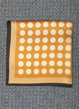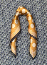 Dette silketørklæde er med okkergul baggrund, creme prikker med creme striber og mørkebrun kant.