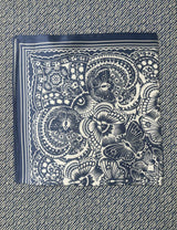 Dette silketørklæde er med råhvid baggrund, sommerfugle og grafisk mønster i blå med en stribet bord.