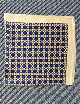 Dette silketørklæde er med grafisk mønster i lilla, orangegul, lys lilla og creme farver med lys vanilje creme kant.