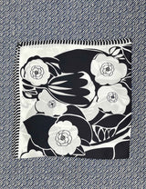 This silk scarf has a white background with a large flower print in black and a border with black/white stripes.
