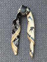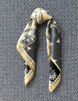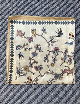 This silk scarf has 1/3 part cream background with japanese inspired flowers in delicate rose, yellow and blue colors with two small birds. Around this, there are different graphic borders in grey, black and beige colors. The scarf can be tied in two ways and appear very different look depending how it is tied.