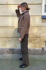 Kristine is the perfect transitional jacket, a short jacket made in a luxurious wool bought in Italy. The jacket is loose fitted with raglan sleeves, flap pockets and rounded dark brown buttons. The fabric is quite heavy, so jacket is warm.