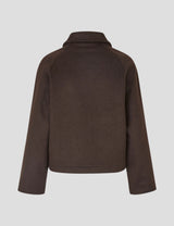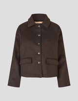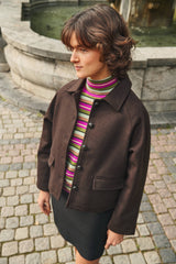 Kristine is the perfect transitional jacket, a short jacket made in a luxurious black soft and warm woolen fabric. It is loose fitting with raglan sleeves, flap pockets and rounded dark brown buttons.