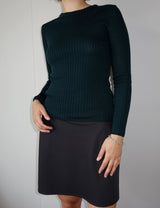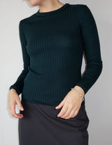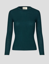 Julia is a wardrobe staple, a round neck rib knit made from a soft and warm merino wool. It is slim fitting and has small ribbed edges on the bottom and sleeves. The neck trim is double layered rib. The knit is normal in the size but is slim fit.