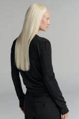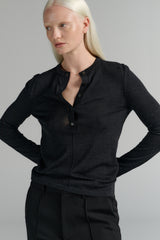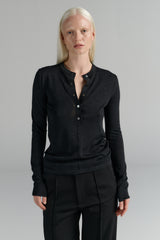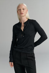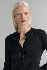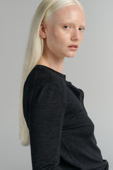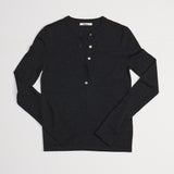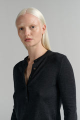 This henley style knit from Rhea is made form a lightweight merino wool. The knit has mother-of-pearl buttons and a seam down the centre both front and back.