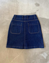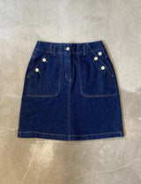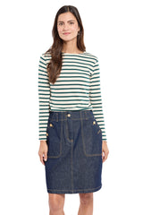The new denim skirt from Armor Lux is made from a heavy denim fabric without stretch. It has wooden buttons at the closure and front pockets. The skirt is high waisted and ends just above the knee.