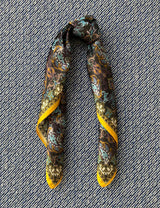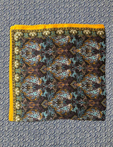 This silk scarf has a dark brown (almost black) background with rococo inspired paisley print in deep purple, light blue, cream and rust yellow with a bright ochre yellow border.