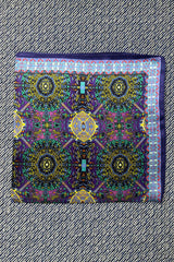 This silk scarf has a bright purple background with a psychedelic pattern in various yellow, green, dark purple and orange colors with a mint, orange red, orange yellow and a slightly lighter purple pattern border.