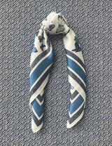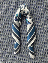 This silk scarf has an off white background with butterflies and flowers in various blue, grey and light beige colours with petrol blue, black and off white stripes as border.
