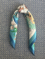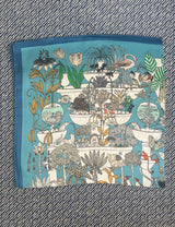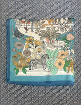 This silk scarf has an off white and petrolblue background with animals, birds, butterflies and flower print in a mixture of bright and suttle green, yellow, rose, peach, orange, navy, brown and burgundy colours with a bright blue border.