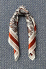 This silk scarf has a cream background with paisley print in rust brown colors with two rose/nude melange and a bright rust orange wide stripe as border.