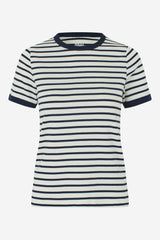 Rib t-shirt in off white with navy stripes and contrast trimmings.