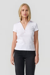 Our Augusta polo shirt is made in a soft deadstock cotton rib, the model is slim fit and slightly shorter in length than our other t-shirts. It has shirting fabric in white with a fine red pinstripe on collar and placket. The neck open is v-shaped and stitched at bottom so it is not too open.