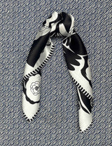 This silk scarf has a white background with a large flower print in black and a border with black/white stripes.