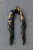 This silk scarf is with partly camel and black background with paisley in bottle green, bright blue, cream and burgundy colors with a bottle green border.