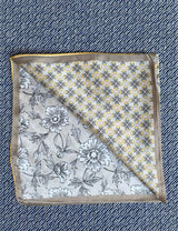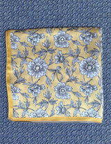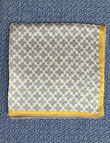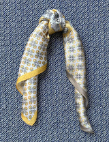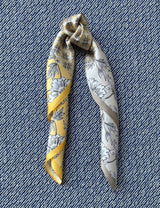 This silk scarf is split in 4 different flower prints in yellow, light beige and off-white colours with a two coloured yellow and beige border. With this design you get two in one scarf, as when tied one way it has small graphic flowers and the other way large flowers in off-white with black edge on a yellow background one side and a light beige background the other side.