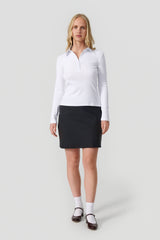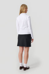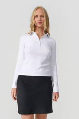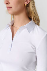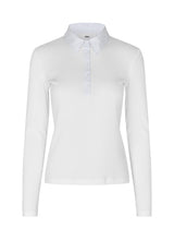 Vores Cathrine polo bluse er lavet i en lækker blød deadstock bumuldsrib, modellen er slank i pasformen og lidt kortere i længden end vores normale t-shirts. Den har skjortestof i hvid med en tynd navyblå stribe på kraven og stolpen foran. Små perlemorsknapper i hvid.