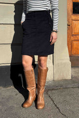 Cecilia nederdel i blød babyfløjl med let stretch, som giver en behagelig pasform. Nederdelen er retroinspireret og har praktiske sidelommer med flap og knap. Den sidder i taljen og har en længde, der slutter over knæet. Foran lukkes den med lynlås, og bagpå har den bærestykke uden lommer for et enkelt og feminint udtryk.