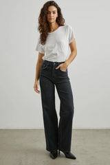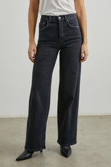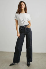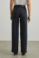 Højtaljede jeans fra Rails med brede ben. Jeansene er mere tætsiddende ved hofterne og låret og brede fra slutning af låret og hele vejen ned. Materialet er kraftigt, men har en smule stræk, så de er behagelige at have på. Vi anbefaler, at man går en størrelse ned, da de er store i størrelsen.