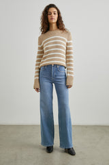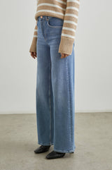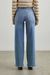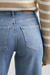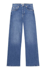 Højtaljede jeans fra Rails med brede ben. Jeansene er mere tætsiddende ved hofterne og låret og brede fra slutning af låret og hele vejen ned. Materialet har en smule stræk, så de er behagelige at have på. Vi anbefaler, at man går en størrelse ned, da de er store i størrelsen.