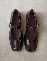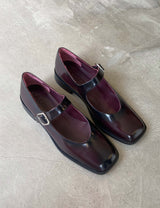 Nyhed fra Augusta dette efterår er den lidt grovere version af de klassiske Mary Janes. Skoen er i blank mørk chancerende bordeaux læder har en hæl på 3 cm og en rem over foden.