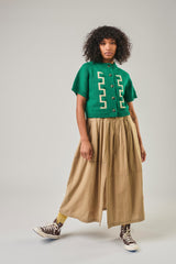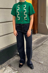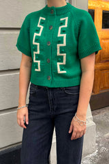 Key cardigan fra Degen er lavet i en lækker kraftig peruviansk uld med fine beigefarvede hornknapper. Cardiganen er lidt kort i kroppen og har brede korte ærmer. Den er klar grøn med lys beigefarvet intarsiamønster og små teksturerede kugler ned langs stolpen foran.