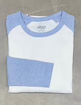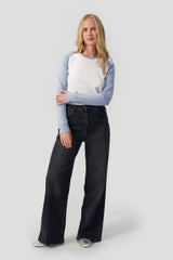Rib langærmet t-shirt i råhvid med lyseblå meleret kontrast ærmer og halskant.