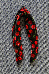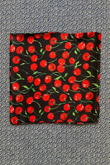 Dette silketørklæde har sort baggrund med røde kirsebær på grønne stilke.