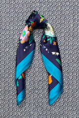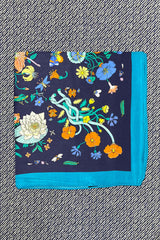 Dette silketørklæde er med navy blå baggrund, blomster og sommerfugle print i stærk gul, orange og grøn samt sarte pasteller i mint, rosa, lavendel blå og råhvid med en bred, klar turkisblå bord.