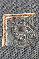Dette silketørklæde er med en råhvid baggrund med sjalsmønster i blå, gule og hindbær pastel farver med sort omrids og en fersken farvet bord med forskellige dyr og creme kant.