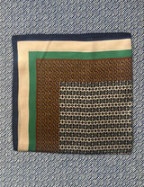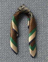 Dette silketørklæde har et grafisk mønster i brune, camel og creme nuancer med tre striber som bord i klar grøn, beige og navy.