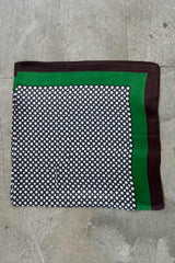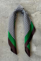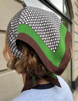 Dette silketørklæde er i et brunt, hvidt, grønt og sølvgrå grafisk print med en brun og græsgrøn kant.