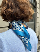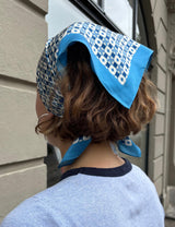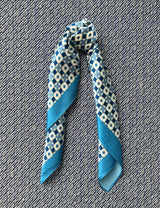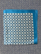 Dette silketørklæde er med grafisk mønster i hvid og forskellige blå farver med en klar cyan blå kant.