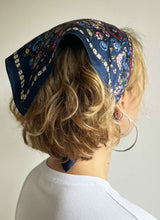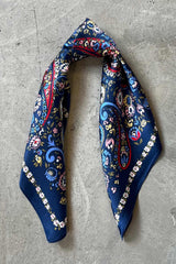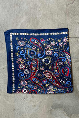 Dette silketørklæde er navy med sjalsmønster og blomster i blå, rosa, rød, sennepsgul, creme og armygrønne farver.