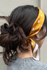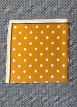 Dette silketørklæde er med en varm okkergul baggrund, creme prikker med creme og mørkebrun kant.