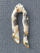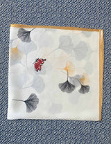 Dette silketørklæde er med råhvid baggrund, blade der ligner små vifter i sort og okkergul og to små røde sommerfugle. Tørklædet har en smal okkergul kant.
